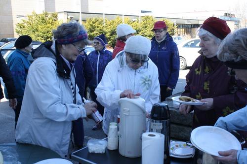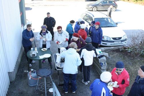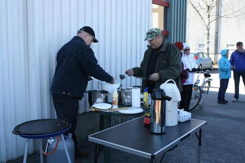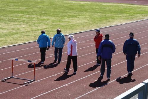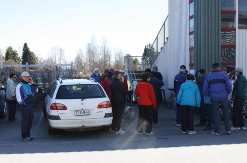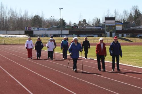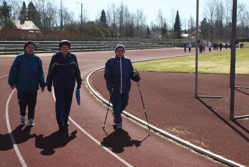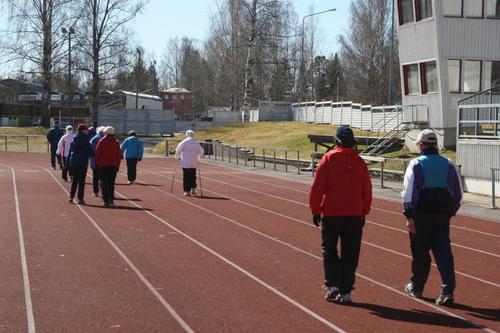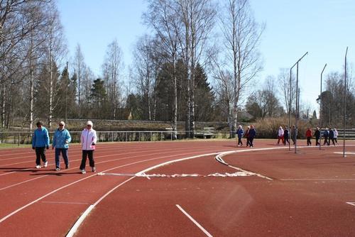 Kevään siihen mennessä lämpimimpänä päivänä yli 30 senioria nautti kävelystä Lapuan urheilukentän joustavalla juoksuradalla. Kävelyn lomassa ja sen pääätteeksi toinen nautinto oli Tapio Rintaniemen sekä Antti ja Pirkko Muilun tarjoilemat lättykahvit. Kuvat Heikki Keisala.