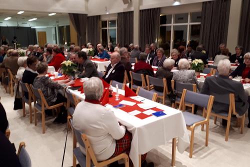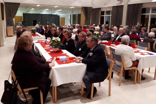 Joulujuhlan osanottajia olivat 97 senioria ja vieraana kappalainen Jukka Tuppurainen. Jukan puheenvuoron lisäksi muu ohjelma hoitui oman väen voimin. Päänumero taisi olla kuitenkin perinteinen jouluateria. Kuvat Heikki Keisala