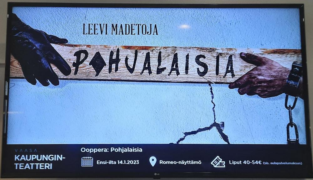 - Pohjalaisia-ooppera Vaasan kaupunginteatterissa alkoi tiistaina 24.1. klo 13.00, ja meitä oli 27 senioria sitä katsomassa. Ooppera on ihan hyvä, mutta tässäkin esityksessä varsinkin naislaulajien sanoista ei tahdo saada selvää. Ennen esitystä nautittiin hyvä lounas Svenska Klubbenilla eli ravintola Bacchuksessa. - Klikkaa alla olevaa kuvaa. Lisäkuvia myös täällä.